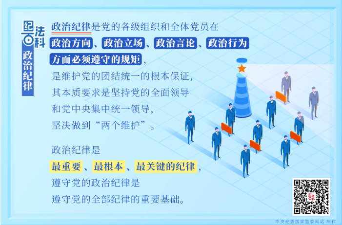 政治纪律是党的各级组织和全体党员在政治方向、政治立场、政治言论、政治行为方面必须遵守的规矩,是维护党的团结统一的根本保证,其本质要求是坚持党的全面领导和党中央集中统一领导,坚决做到“两个维护”。