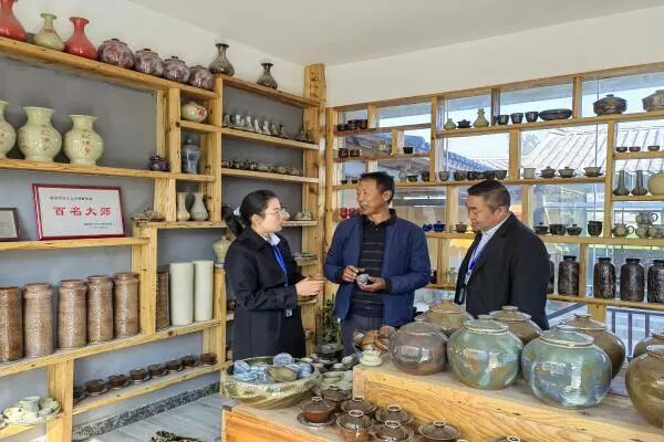 临翔区纪检监察干部深入碗窑村开展精准监督、护航非遗发展。图为临翔区纪检监察干部在碗窑村走访省级非遗传承人、临沧土陶制作大师邓安康。罗晓丽 摄